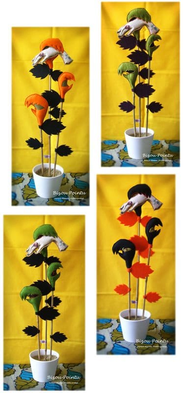 “Bad Botanik’ for Bad Girls” est un bou­quet de trois plantes car­ni­vores tex­tile (feu­trine, tis­sus coton, tiges bam­bou, rem­bour­rage poly­esther) main­tenu avec de la laine bouil­li dans un pot (terre cuite peinte achetée dans le com­merce).