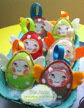 Il fait 5,5 cm de haut et existe en taupe, gris perle, rouge, vert anis (chaque ruban est différent pour chaque couleur d’Oeuf)- feutrine, coton, remplissage polyesther…