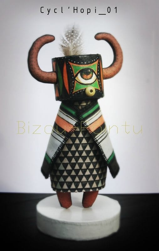 inspiré de l’art des indiens d’amérique-tribu “Hopi”-avec notamment leur poupées “Cachinas”.