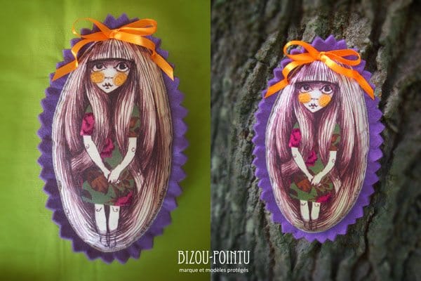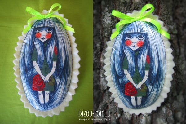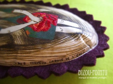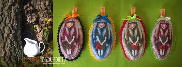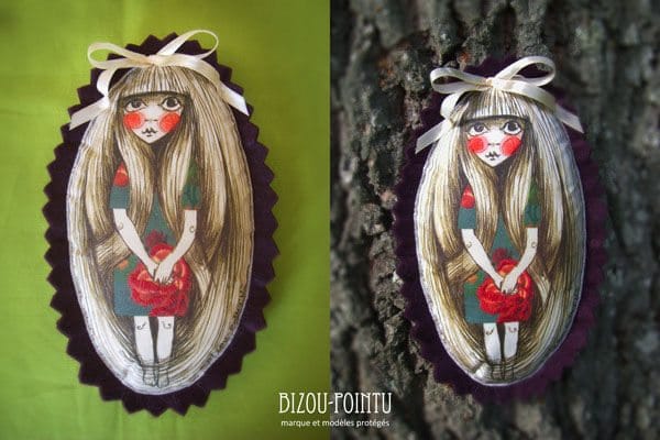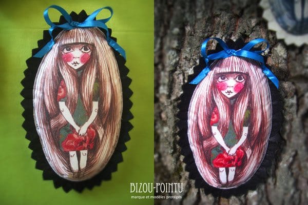 “Des cheveux comme de l’eau” existe aussi en 4 petits modèles de 13,5 cm de haut (attache visible sur “Tête” du médaillon).Attention, les petits modèles ne sont pas brodés (fleurs et joues)!