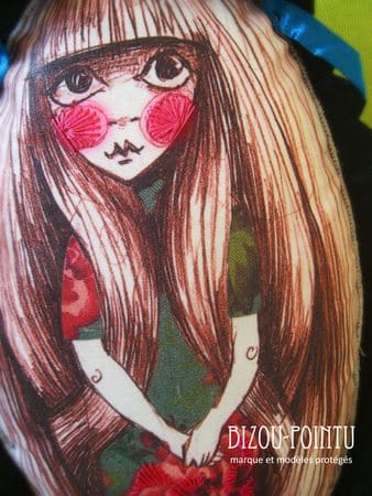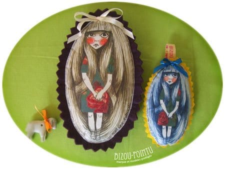 “des cheveux comme de l’eau” est déclinée en 4 grandes versions, dim: 21,5 cm de haut, fabrication: feutrine, tissus coton, ruban de satin,fil et rembourrage polyesther.