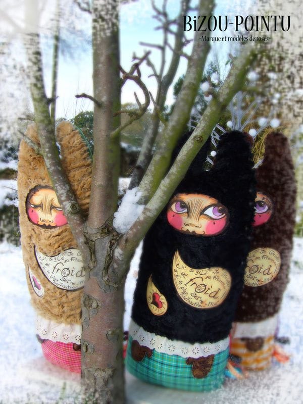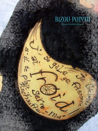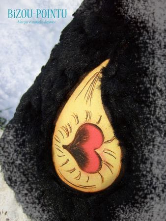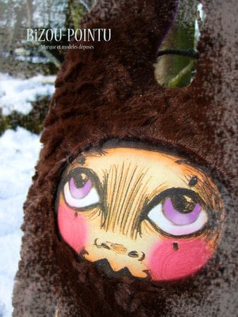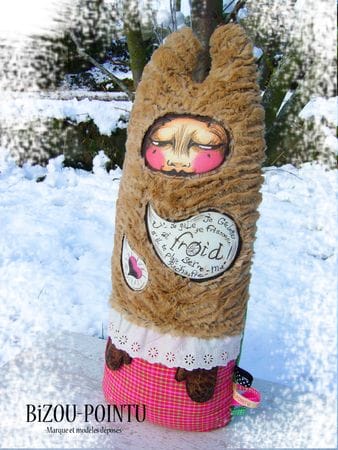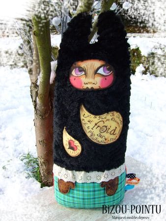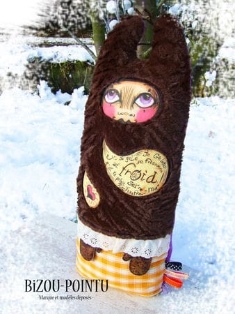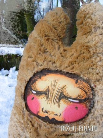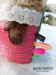 Elle est en polaire, fourrure archi-douce synthétique, broderie anglaise, tissus coton et simili cuir et fait aproximativement 60 cm de haut…la taille idéale pour être prise dans des bras accueillants…