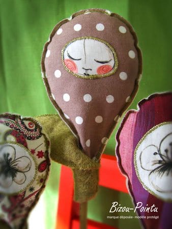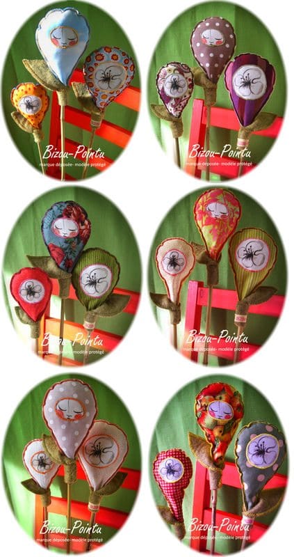 Catalogue de “Ma ptite botanique”, bouquet de 3 fleurs textiles (deux motifs fleurs et un visage d’enfant), est fabriqué en tissus coton, feutrine, laine bouillie et tuteurs- bambou…existe en 6 versions (motifs tissus devant et dos différents pour chaque version.