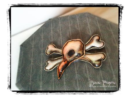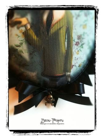 Bas de l’illustration avec Breloque en cuivre et noeud de satin noir…